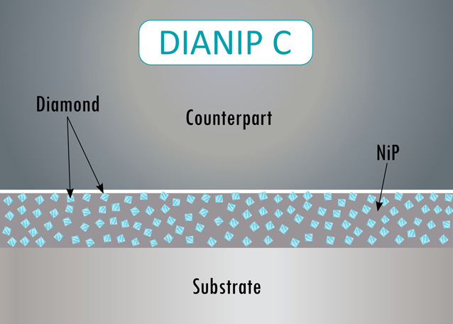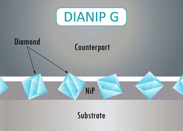 金剛石涂層是由單晶金剛石和化學鎳基體組成,DIANIP涂層嵌入的金剛石顆粒尺寸非常均勻一致。涂層功能性主要取決于嵌入涂層金剛石顆粒的尺寸。涂層功能主要體現(xiàn): 硬度、磨損性能、摩擦性能、配合性、尖銳化。單晶金剛石顆粒尺寸的完美選擇和定義使得涂層表面形貌非常規(guī)則,涂層定義明確化。共沉積和涂層是通過化學方法進行,這種方法可以完成完全規(guī)則厚度的表面涂層,而不受基體邊緣尺寸的影響,并且在復雜表面的狹小尺寸處也能完好的進行涂層并沉積金剛石顆粒。涂層可以保證金剛石顆粒60%的尺寸嵌入鎳涂層, 金剛石在涂層中牢固錨定。此外,DIANIP技術(shù)還允許在化學鎳的基體中引入高比重含有小粒徑(約3μm)的金剛石顆粒,生產(chǎn)出極為耐磨的復合涂層